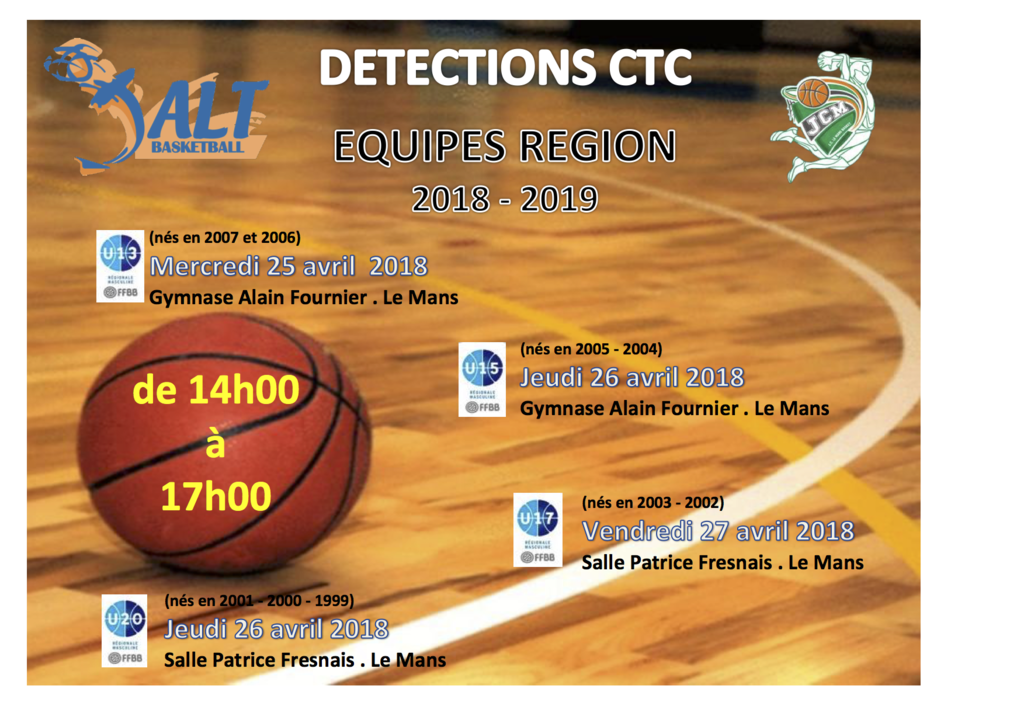 - pour les U13 (nés en 2007 et 2006), le mercredi 25 avril 2018 au gymnase Alain Fournier au Mans;
